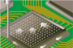 這些關(guān)鍵問(wèn)題包括:得到完整的和無(wú)空洞的芯片底部膠流,在緊密包裝的芯片周圍分配膠,避免污染其它元件,通過(guò)射頻外殼或護(hù)罩的開口滴膠,控制助焊劑殘留物。取得完整和無(wú)空洞的膠流,因?yàn)樘畛洳牧媳仨毻ㄟ^(guò)毛細(xì)管作用吸入芯片底部,所以關(guān)鍵是要把針嘴足夠靠近芯片的位置,開始膠的流動(dòng)。